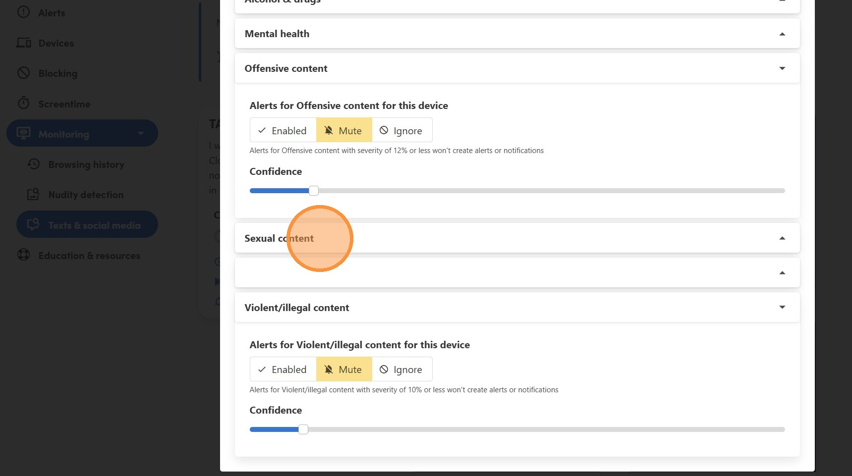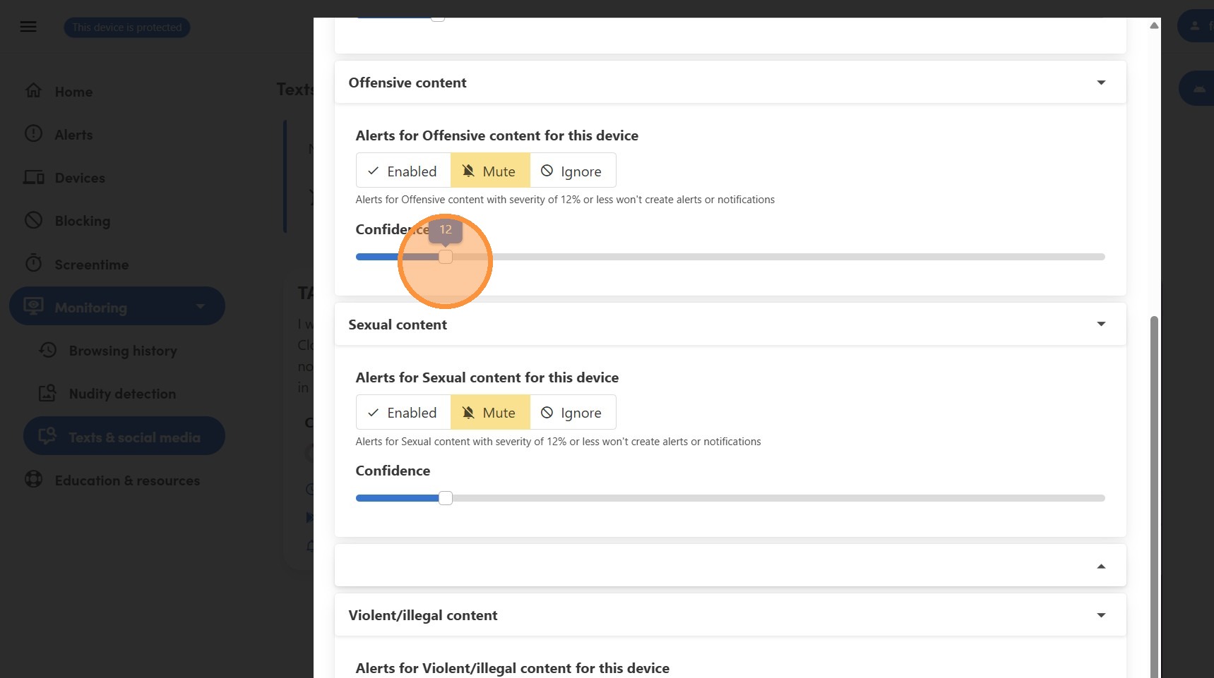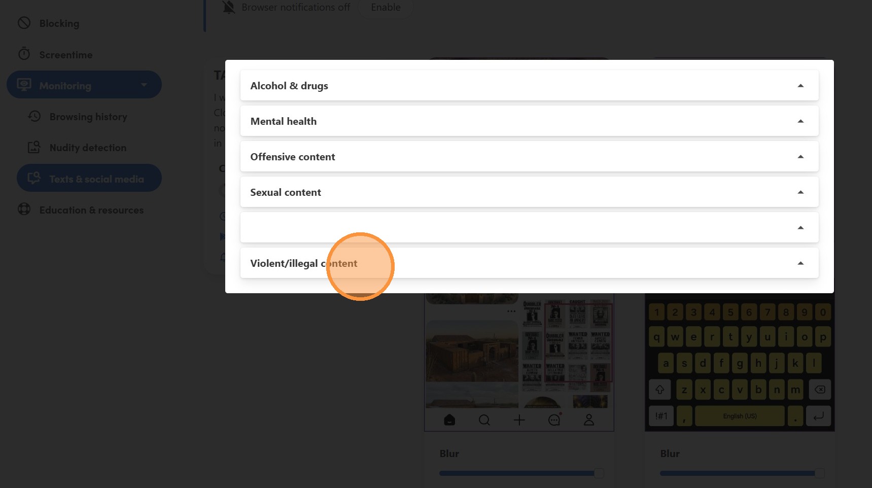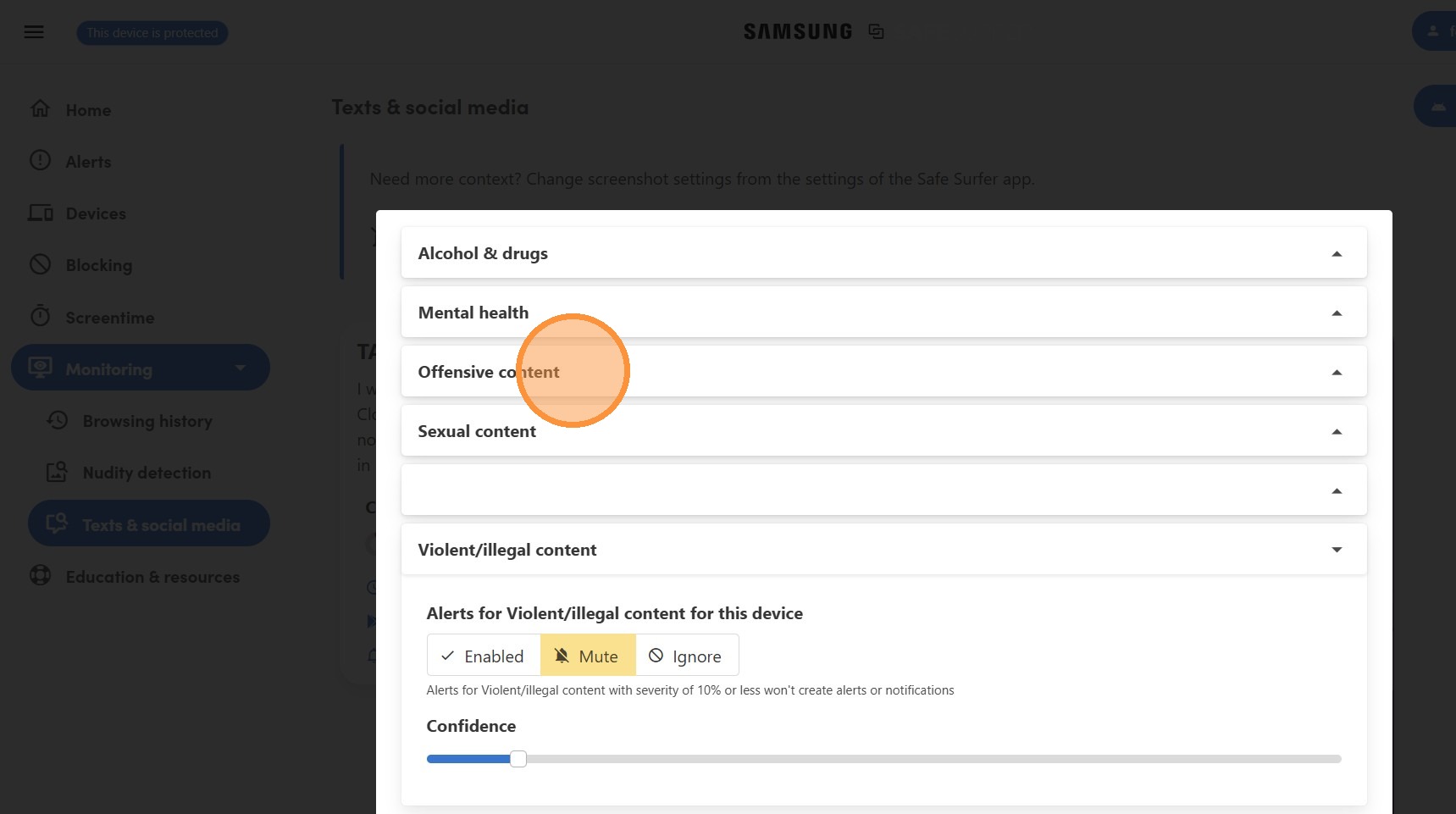 Learn how to customize your Safe Surfer monitoring settings to filter specific content categories on a device. This guide helps you manage digital protection by enabling strict monitoring for harmful or offensive material.