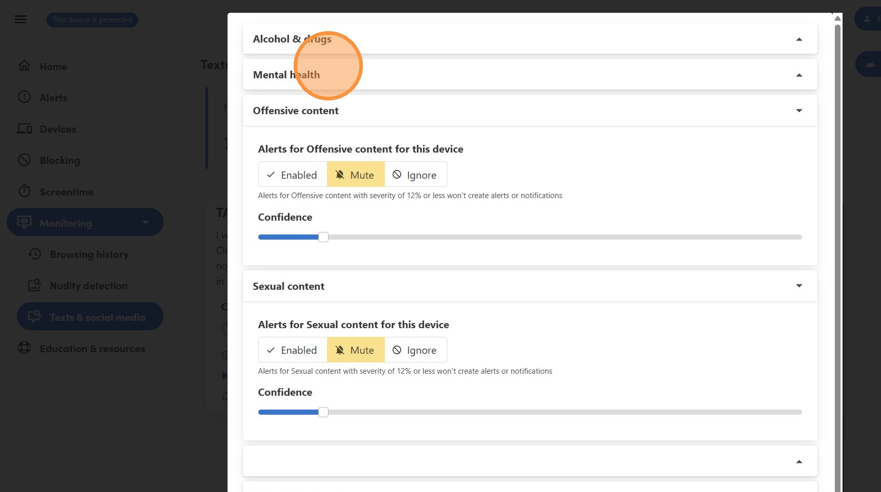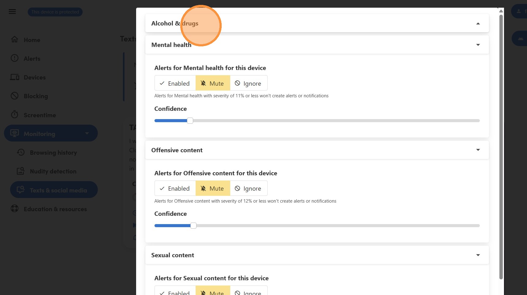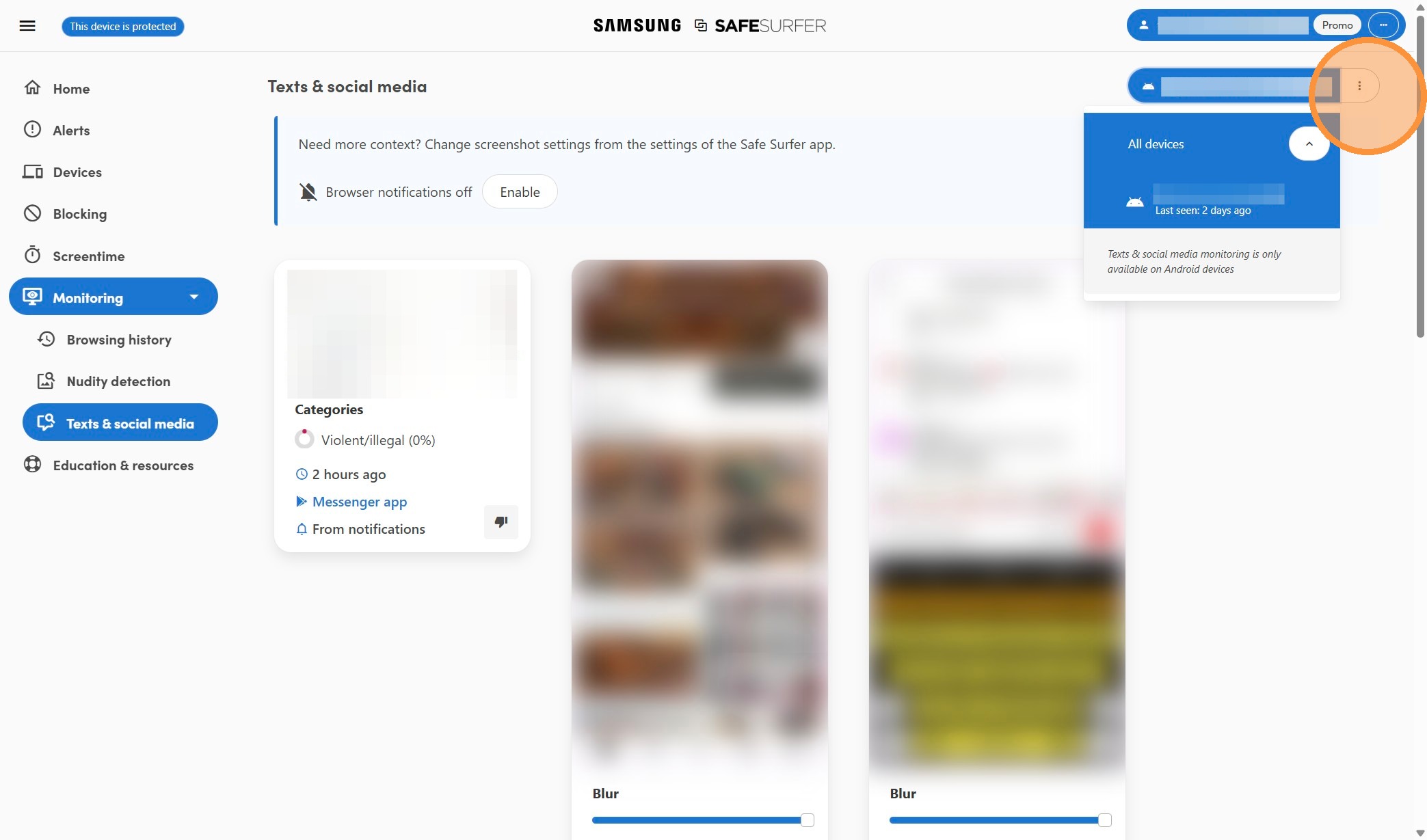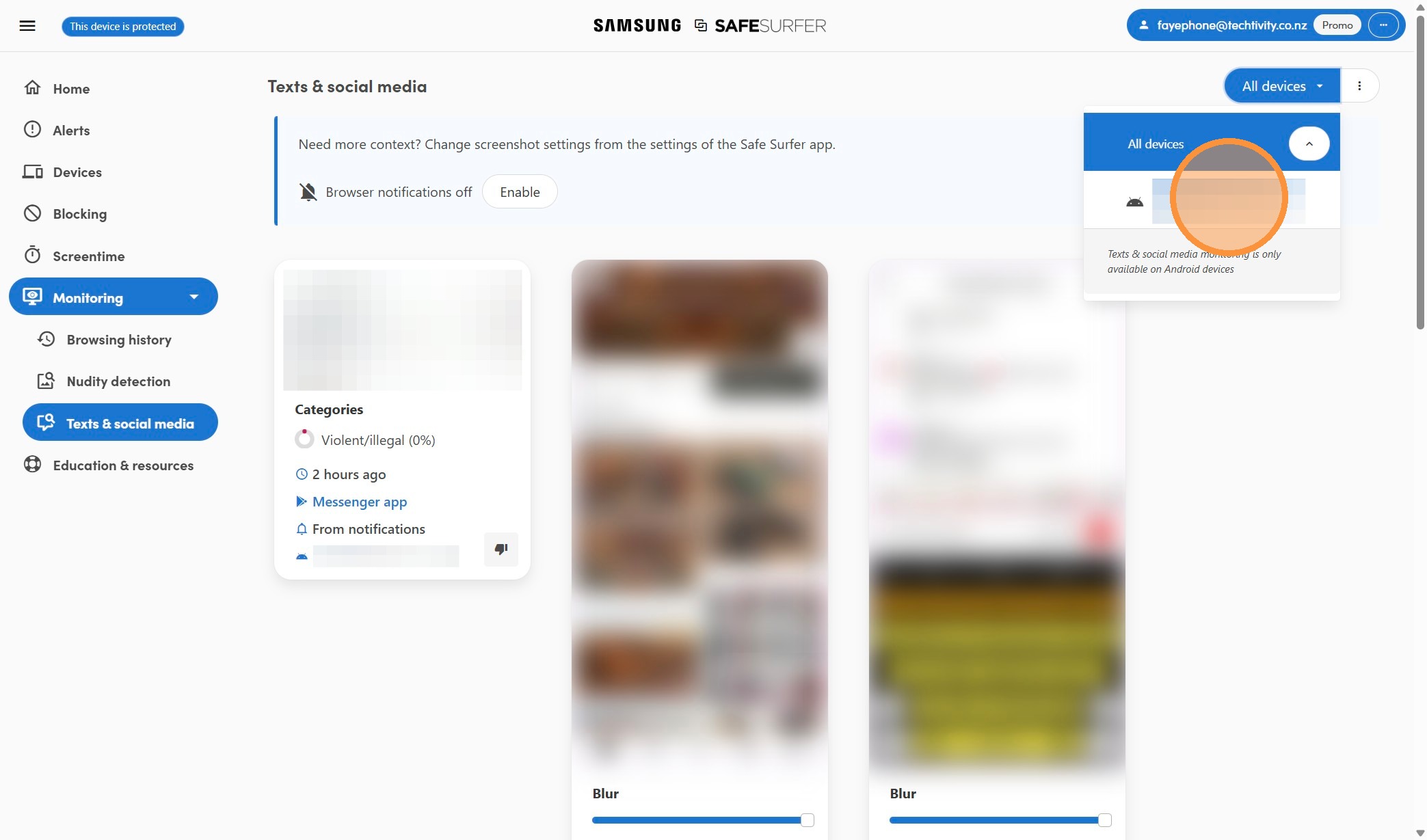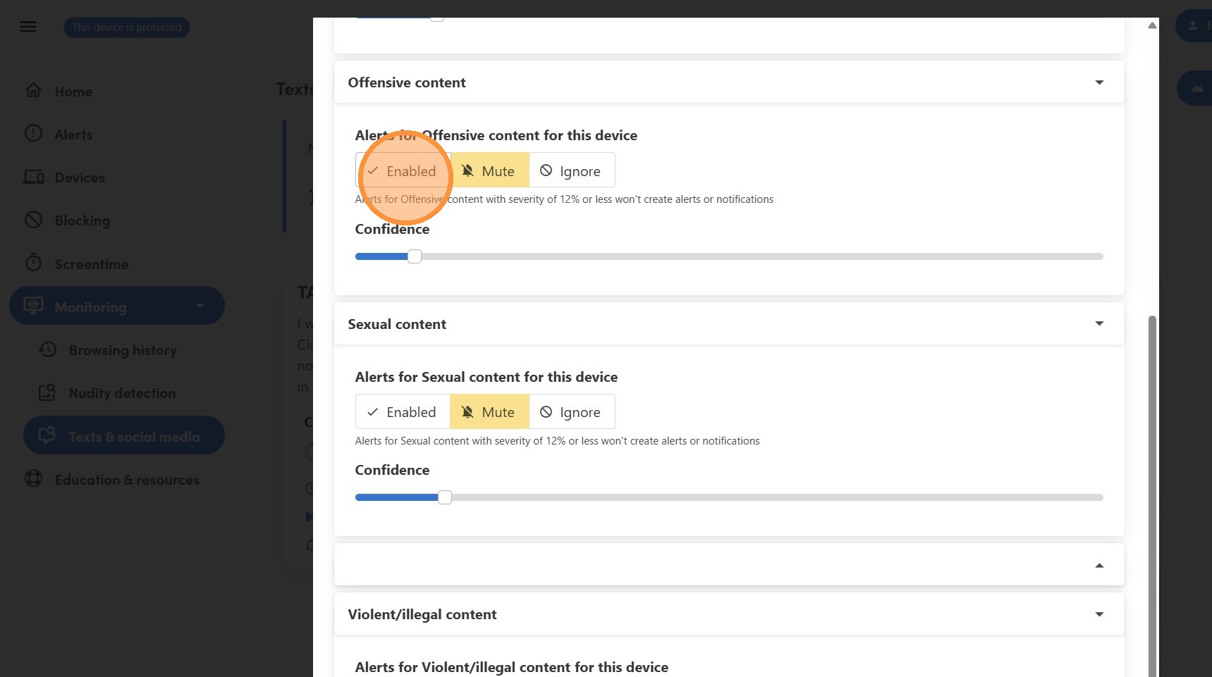 Learn how to customize your Safe Surfer monitoring settings to filter specific content categories on a device. This guide helps you manage digital protection by enabling strict monitoring for harmful or offensive material.